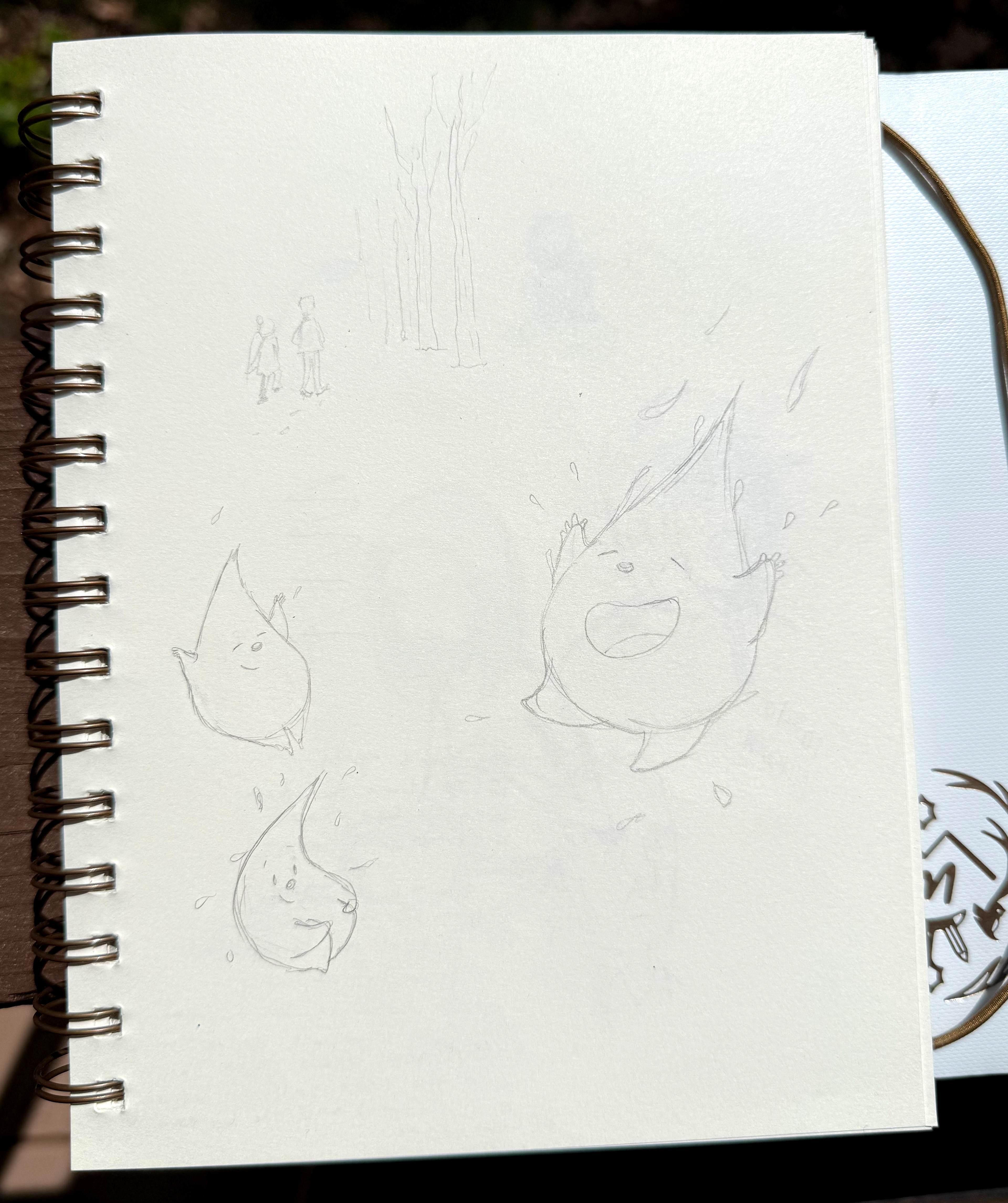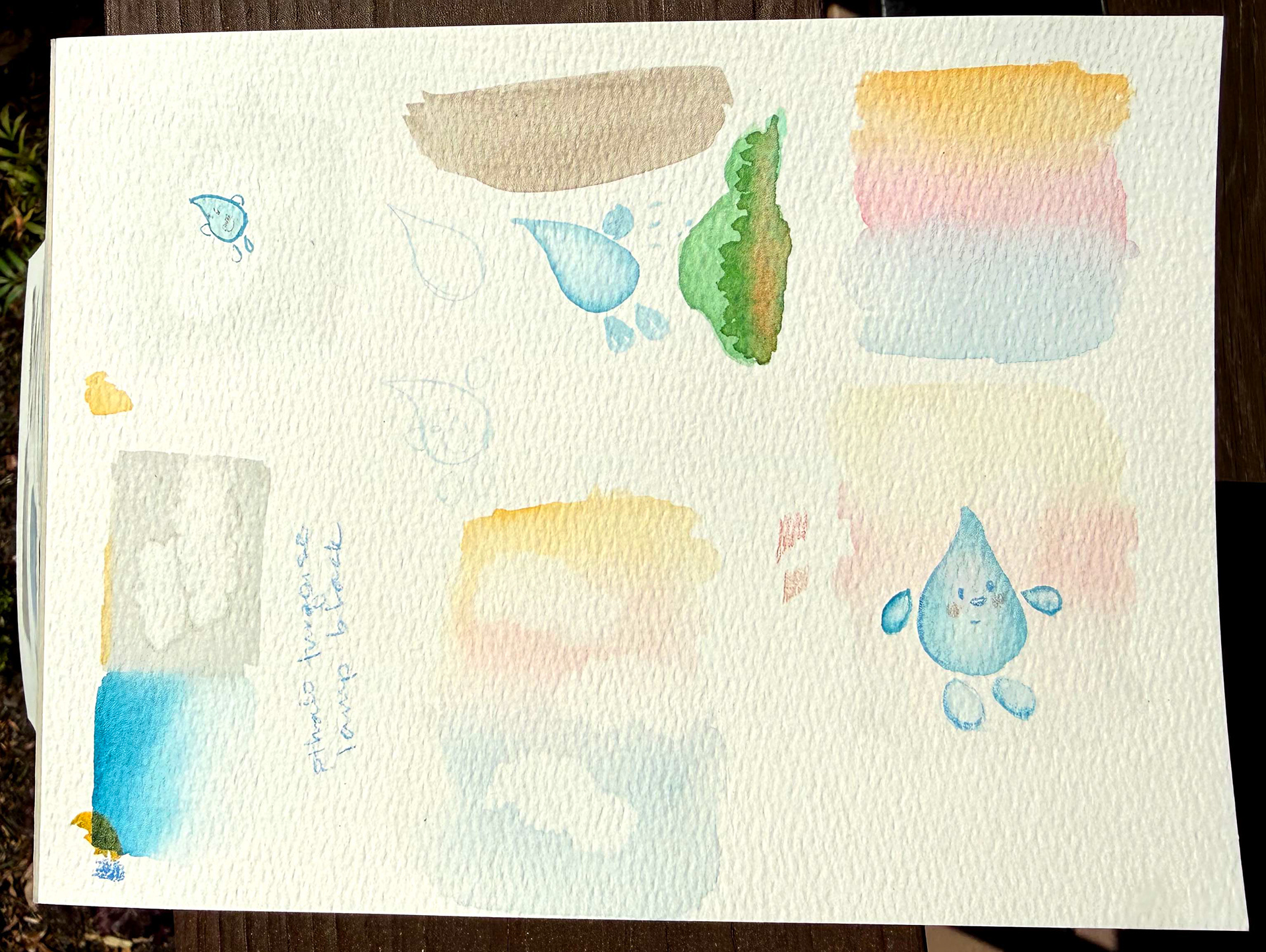 Color Exploration: I wasn't sure how Droplete's backdrop would go, so I played with watercolors for a bit. Every morning, while walking my kids to the bus stop, we got to see beautiful sunrises — Beautiful gradients of peach, pink, and gold. That felt right for Droplete. The world she was jumping into should be beautiful.